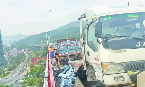 貨車遭攪拌車追尾 車頭騎上大橋護(hù)欄