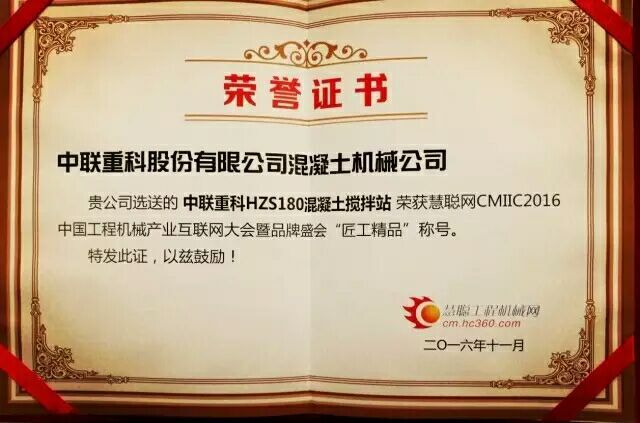 中聯(lián)重科HZSE180/HZS180產(chǎn)品4.0攪拌站榮獲CMIIC2016中國工程機(jī)械產(chǎn)業(yè)互聯(lián)網(wǎng)大會(huì)“匠工精品”稱號(hào),這標(biāo)志著中聯(lián)重科4.0攪拌站產(chǎn)品得到了行業(yè)的充分認(rèn)可。
