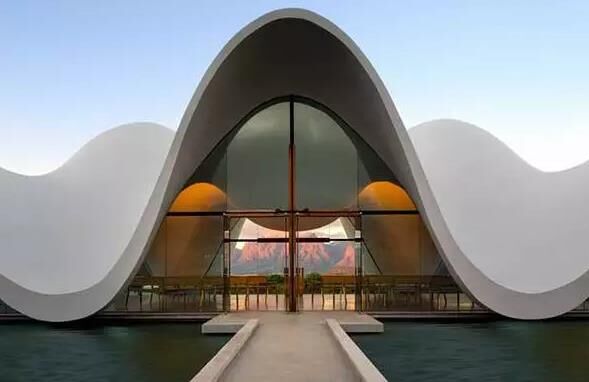 整個(gè)教堂就是一片被“軟化”的混凝土片,飄浮著嵌在四片玻璃上。這片混凝土通過優(yōu)雅地起伏完成自我支撐,同時(shí)營造出一個(gè)完整獨(dú)立的空間。十字架與窗框結(jié)合,完整且恰到好處。四周的景色在起伏的屋頂曲線的“剪切”下呈現(xiàn)出對(duì)稱、均衡的完美構(gòu)圖。