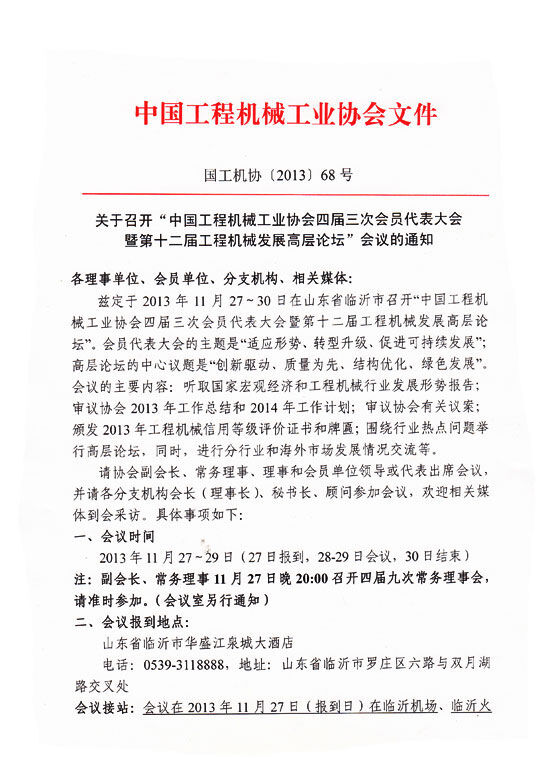 關(guān)于召開“中國(guó)工程機(jī)械工業(yè)協(xié)會(huì)四屆三次會(huì)員代表大會(huì)”會(huì)議的通知