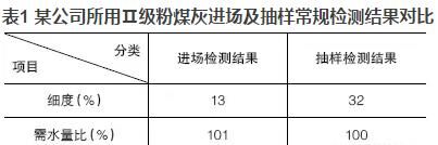 優(yōu)質(zhì)的粉煤灰摻入混凝土可明顯地改善混凝土的和易性,當(dāng)粉煤灰摻量大于膠材總量的5%~10%時(shí),效果極為明顯?,F(xiàn)今在混凝土實(shí)際生產(chǎn)中,粉煤灰摻量往往達(dá)到20%,有的甚至高達(dá)30%,但混凝土的和易性卻不盡人意。抽取原材料進(jìn)行檢測(cè)時(shí),發(fā)現(xiàn)粉煤灰的檢測(cè)結(jié)果經(jīng)常不滿足標(biāo)準(zhǔn)要求或者與驗(yàn)收時(shí)的結(jié)果相差甚遠(yuǎn)?,F(xiàn)以某公司所用Ⅱ級(jí)粉煤灰進(jìn)場(chǎng)及抽樣常規(guī)檢測(cè)結(jié)果進(jìn)行對(duì)比,見(jiàn)表1。