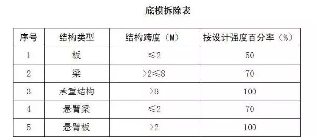 底模:構(gòu)件跨度大于8m的混凝土強(qiáng)度達(dá)到設(shè)計(jì)強(qiáng)度的100%后,方可拆除。構(gòu)件跨度小于8m的混凝土強(qiáng)度達(dá)到設(shè)計(jì)強(qiáng)度的75%后,方可拆除。預(yù)應(yīng)力部位的拆模為達(dá)到設(shè)計(jì)要求的混凝強(qiáng)度和預(yù)應(yīng)力完成后拆除。