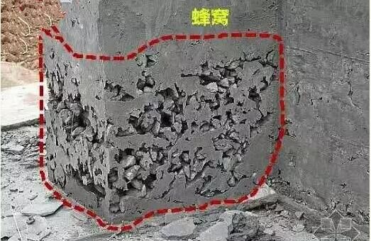 蜂窩有表面的、深井的和貫通的三種,也常遇到水平的、傾斜的、斜交的單獨蜂窩和相連的蜂窩群,其表現(xiàn)為局部表面酥松,無水泥漿,粗骨料外露深度大于5mm(小于混凝土保護層厚度),石子間存在小于最大石子粒徑的空隙,呈蜂窩狀,有蜂窩處的混凝土強度很低。