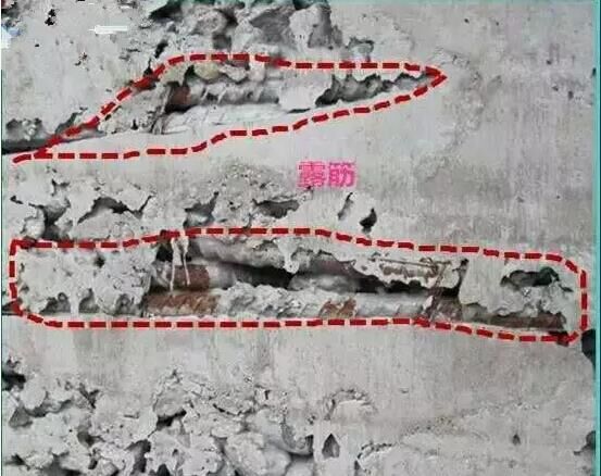 在鋼筋混凝土澆筑過程中振搗不到位,保護層墊塊沒有設(shè)置或者固定不牢固,混凝土坍落度小,或拆模早,混凝土硬化前受外力導(dǎo)致剝落而使構(gòu)件成型后鋼筋外露的現(xiàn)象。