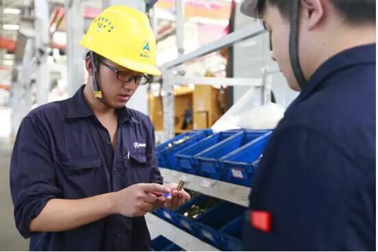 奉俊翔今年剛滿28歲,別看年紀(jì)不大,卻是一個地地道道的三一“老人”,入司八年以來,奉俊翔已經(jīng)帶出了8名徒弟。如奉俊翔這樣的“80后”技術(shù)骨干在泵車裝配班還有很多,他們已成為技術(shù)培訓(xùn)和傳承“精益制造”的中堅力量。每天早會后,老員工們會將新人聚在一起,為新人工作中遇到的問題答疑解惑。這種“師帶徒”制度促進(jìn)了年輕工人的成長,也加快了企業(yè)發(fā)展。
