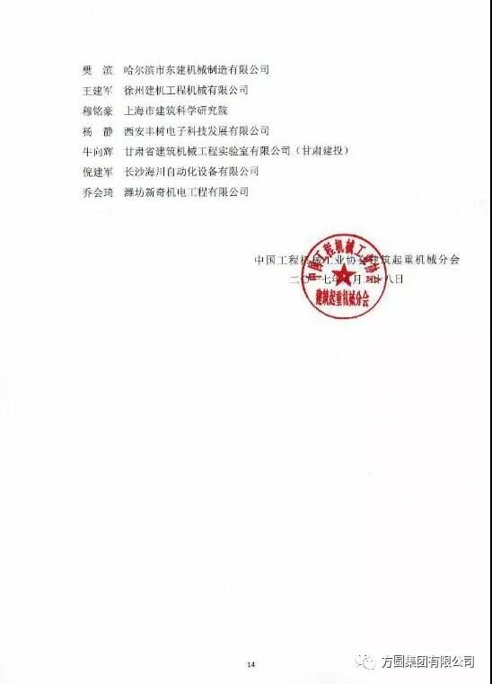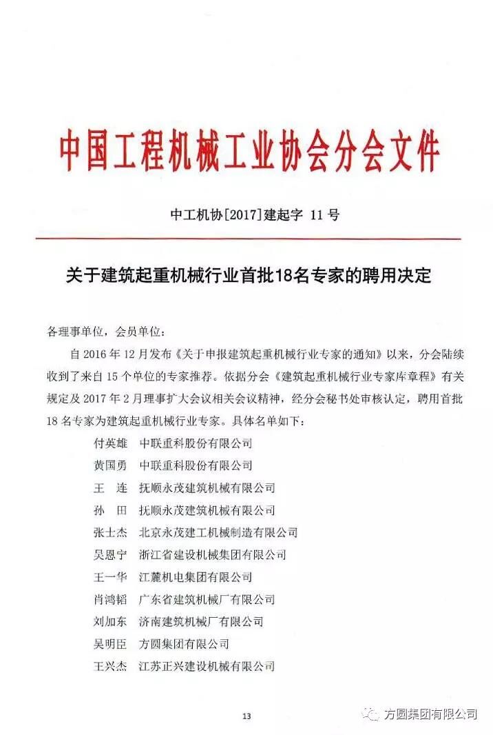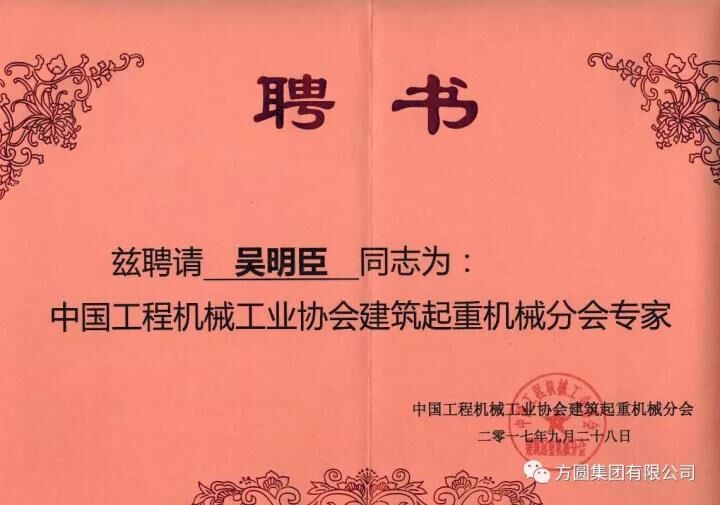 在11月9日召開的中國(guó)工程機(jī)械工業(yè)協(xié)會(huì)建筑起重機(jī)械分會(huì)年會(huì)上,以中工機(jī)協(xié)【2017】建起字11號(hào)文件公布了《關(guān)于建筑起重機(jī)械行業(yè)首批18名專家的聘用決定》,聘用首批18名專家為建筑起重機(jī)械行業(yè)專家,方圓集團(tuán)副總工程師吳明臣名列其中。