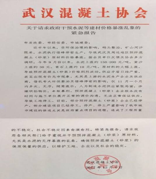 武漢混凝土協(xié)會網(wǎng)站4日發(fā)布《關(guān)于請求政府干預(yù)水泥等建材價(jià)格暴漲亂象的緊急報(bào)告》,《報(bào)告》表示,上游的水泥生產(chǎn)企業(yè)及供應(yīng)商借機(jī)夸大環(huán)保整治及錯(cuò)峰停窯的影響,僅11月有一個(gè)月內(nèi)多次、無序,隨意漲價(jià),人為制造水泥供應(yīng)緊張局面,涉嫌哄抬物價(jià),牟取暴利。因?yàn)閮r(jià)格原因無法正常保證混凝土(砂漿)的正常供應(yīng),部分建設(shè)項(xiàng)目已經(jīng)停工。