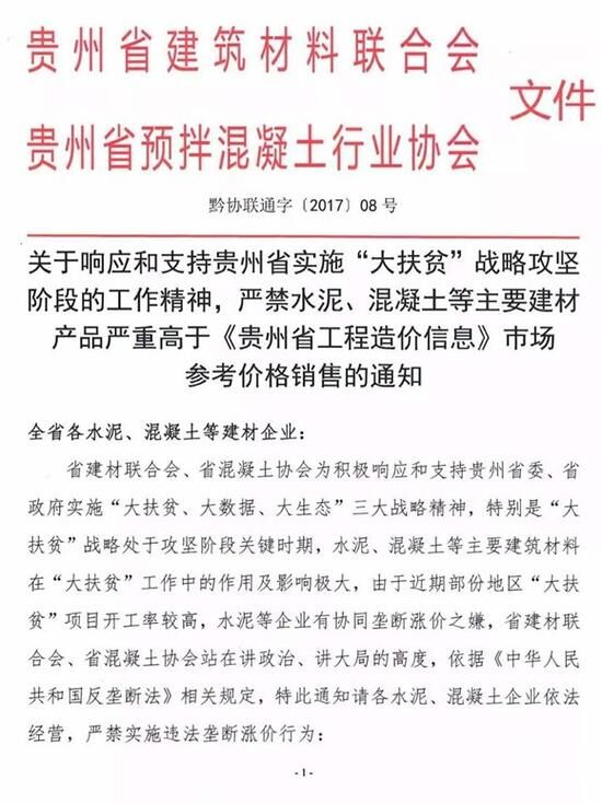 12月5日,貴州省建筑材料聯(lián)合會和貴州省預(yù)拌混凝土行業(yè)協(xié)會聯(lián)合發(fā)文《關(guān)于響應(yīng)和支持貴州省實(shí)施“大扶貧”戰(zhàn)略攻堅(jiān)階段的工作精神,嚴(yán)禁水泥、混凝土等主要建材產(chǎn)品嚴(yán)重高于<貴州省工程造價(jià)信息>市場參考價(jià)格銷售的通知》(黔協(xié)聯(lián)通字〔2017〕08號)(下文稱為《通知》)。