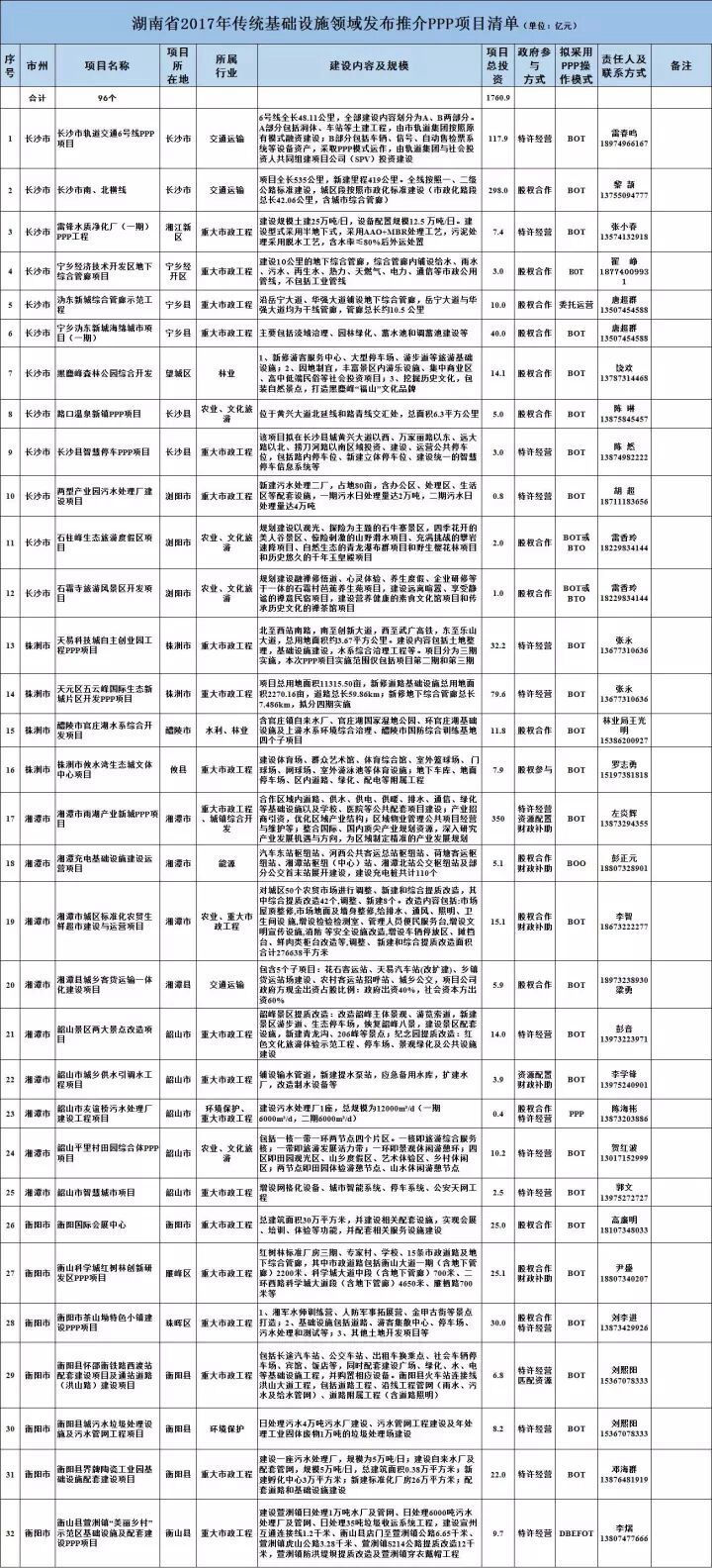 湖南發(fā)改委擬發(fā)布推介傳統(tǒng)基礎(chǔ)設(shè)施領(lǐng)域PPP項目96個,合計總投資1760.9億元。從領(lǐng)域看,能源領(lǐng)域4個,交通運輸領(lǐng)域4個,水利領(lǐng)域8個,環(huán)保領(lǐng)域10個,林業(yè)領(lǐng)域5個,農(nóng)業(yè)領(lǐng)域10個,重大市政工程領(lǐng)域55個。