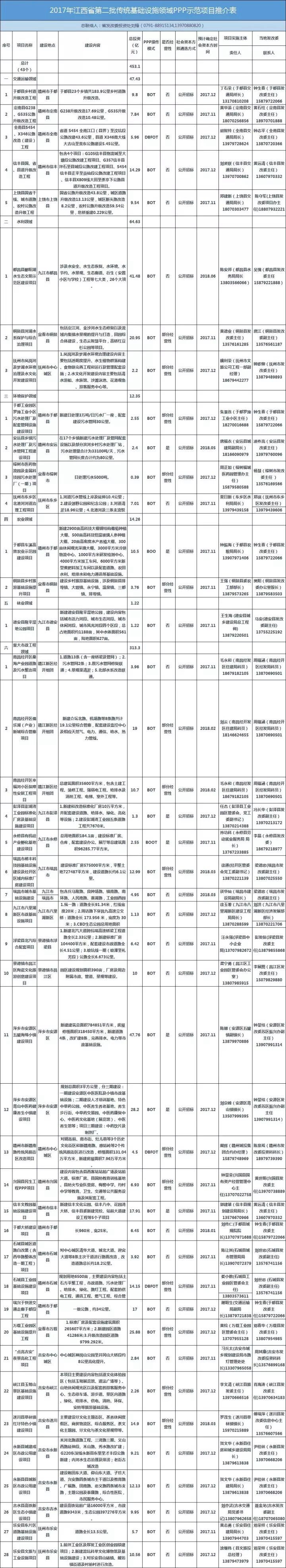 江西發(fā)改委推介2017年43個PPP項目,總投資453.14億元。