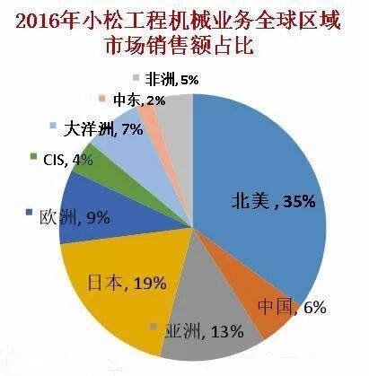 盡管每年有大筆收入來自中國,但小松工程機械業(yè)務(wù)最大的市場其實是北美,銷售額占比35%;中國銷售占比只有6%,還不如日本本土——19%。