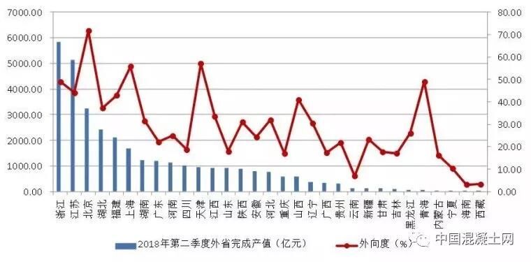 圖4 2018年上半年各地區(qū)跨省完成的建筑業(yè)總產值及外向度