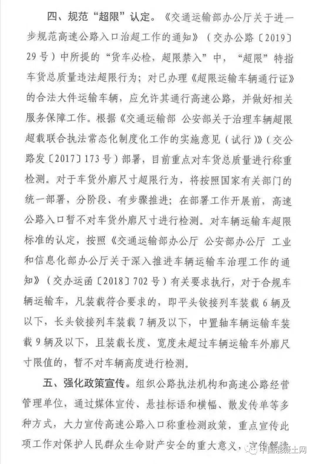 一、嚴(yán)格執(zhí)行全國(guó)統(tǒng)一的違法超限超載認(rèn)定標(biāo)準(zhǔn)。嚴(yán)格按照《交通運(yùn)輸部 公安部關(guān)于治理車輛超限超開車聯(lián)合執(zhí)法常態(tài)化制度化工作的實(shí)施意見 (試行)》(交公路發(fā)【2017】173號(hào))規(guī)定的《公路貨運(yùn)車輛超限超載認(rèn)定標(biāo)準(zhǔn)》執(zhí)行,嚴(yán)禁隨意提高或者降低認(rèn)定標(biāo)準(zhǔn)。其中,六軸列車驅(qū)動(dòng)形式為6×4的總質(zhì)量限值為49噸,驅(qū)動(dòng)形式為6×2的總質(zhì)量限值為46噸。各地不得因驅(qū)動(dòng)形式為6×4人列車未辦理ETC而簡(jiǎn)單按照46噸處理,不得簡(jiǎn)化宣傳,出現(xiàn)如“貨車最大總質(zhì)量限定為46噸”宣傳標(biāo)語,造成公眾誤解。對(duì)驅(qū)動(dòng)軸為每軸每則雙輪胎且裝備空氣懸架的3軸、車軸貨車以及4軸鉸接列車總質(zhì)量限值各增加1噸。二、統(tǒng)一合理誤差控制標(biāo)準(zhǔn)。考慮到稱重檢測(cè)設(shè)施(設(shè)備)在使用過程中可能出現(xiàn)一定的誤差,對(duì)于貨車稱重檢測(cè)結(jié)果不大于認(rèn)定標(biāo)準(zhǔn)105%(即超限部分未直如過認(rèn)定標(biāo)準(zhǔn)的5%)的,暫按未超限超載處理。鑒于兩軸貨車數(shù)量多、涉及面廣、情況復(fù)雜。目前,部正在商有關(guān)部門研究制定專項(xiàng)治理方案。在相關(guān)部門統(tǒng)一部署專項(xiàng)治理之前,各地對(duì)于車貨總質(zhì)量不超過18噸的兩軸貨車,不得以超限為由禁止其通行高速公路。同時(shí),要做好相關(guān)數(shù)據(jù)的采集與分析工作,為下一步開展專項(xiàng)治理提供支撐。《交通運(yùn)輸部辦公室廳關(guān)于進(jìn)一步規(guī)范高速公路入口治超工作的通知》(交辦公路【2019】29號(hào))中所提的“貨車必檢,超限禁入”中,“超限”特指車貨總質(zhì)量違法超限行為;對(duì)已辦理《超限運(yùn)輸車輛通行證》的合法大件運(yùn)輸致車輛,應(yīng)允許其通行高速公路,并做好相關(guān)服務(wù)保障工作。根據(jù)《交通運(yùn)輸部 公安部關(guān)于治理車輛超限超載聯(lián)合執(zhí)法常態(tài)化制度化工作的實(shí)施意見(試行)》(交公路發(fā)【2017】173號(hào))部署,目前重點(diǎn)對(duì)車貨總質(zhì)量進(jìn)行稱重檢測(cè)。對(duì)于車貨外廓尺寸超限行為,將按照國(guó)家有關(guān)部門的統(tǒng)一部署,分階段、有步驟推進(jìn);在部署工作開展前,高速公路入口暫不對(duì)車貨外廓尺寸進(jìn)行檢測(cè)。對(duì)車輛運(yùn)輸超限標(biāo)準(zhǔn)的認(rèn)定,按照《交通運(yùn)輸 部辦公室廳 公安部辦公室廳 工業(yè)和信息化部辦公室廳關(guān)于深入推進(jìn)車輛運(yùn)輸車治理工作的通知》(交辦運(yùn)【2018】702號(hào))有關(guān)要求執(zhí)行,對(duì)于合規(guī)車輛運(yùn)輸車,凡裝載符合要求的,即平頭鉸接列車裝載6輛及以下,長(zhǎng)頭鉸接列車裝載7輛及以下,中置軸車輛運(yùn)輸車裝載9輛及以下,且裝載長(zhǎng)度、寬度未超過車輛運(yùn)輸車外廓尺寸限值的,暫不對(duì)車輛高度進(jìn)行檢測(cè)。組織公路執(zhí)法機(jī)構(gòu)和高速公路經(jīng)營(yíng)管理單位,通過媒體宣傳、懸掛標(biāo)語和橫幅、散發(fā)傳單等多種方式,大力宣傳高速公路入口稱重檢測(cè)政策,重點(diǎn)宣傳此項(xiàng)工作對(duì)保護(hù) 人民群眾生命財(cái)產(chǎn)安全的重大意義 ,宣傳解讀治超政策、治超標(biāo)準(zhǔn),爭(zhēng)取廣大貨運(yùn)企業(yè)和貨車車主了解政策、熟悉政策,支持政策實(shí)施。要利用稱重檢測(cè)環(huán)節(jié),逐車提醒、提示貨車司機(jī),盡快安裝ETC,充分享受便捷通行、交費(fèi)打折、加油優(yōu)惠、車便利等各種政策紅利,促進(jìn)物流提質(zhì)增效。未盡事宜,按照《超限運(yùn)輸車輛行駛公路管理規(guī)定》和173號(hào)文件等有關(guān)規(guī)定執(zhí)行。各地執(zhí)行過程中出現(xiàn)的要及時(shí)報(bào)部。全國(guó)物流標(biāo)準(zhǔn)非?;靵y,地方標(biāo)準(zhǔn)與國(guó)家標(biāo)準(zhǔn)經(jīng)常“打架”,導(dǎo)致全國(guó)物流司機(jī)苦不堪言,而此次交通廳像各省運(yùn)輸廳發(fā)布特急文件通知,劍指就是統(tǒng)一運(yùn)輸車輛載重的標(biāo)準(zhǔn),令運(yùn)輸行業(yè)向制度化,規(guī)范化過渡。同時(shí)從根源上徹底清除“亂收費(fèi)”現(xiàn)象,并發(fā)布問題反映電話:部科學(xué)研究院:陳宓 18600797358部規(guī)劃院:張新虎 13811681357部路網(wǎng)中心:李友良 15522515653