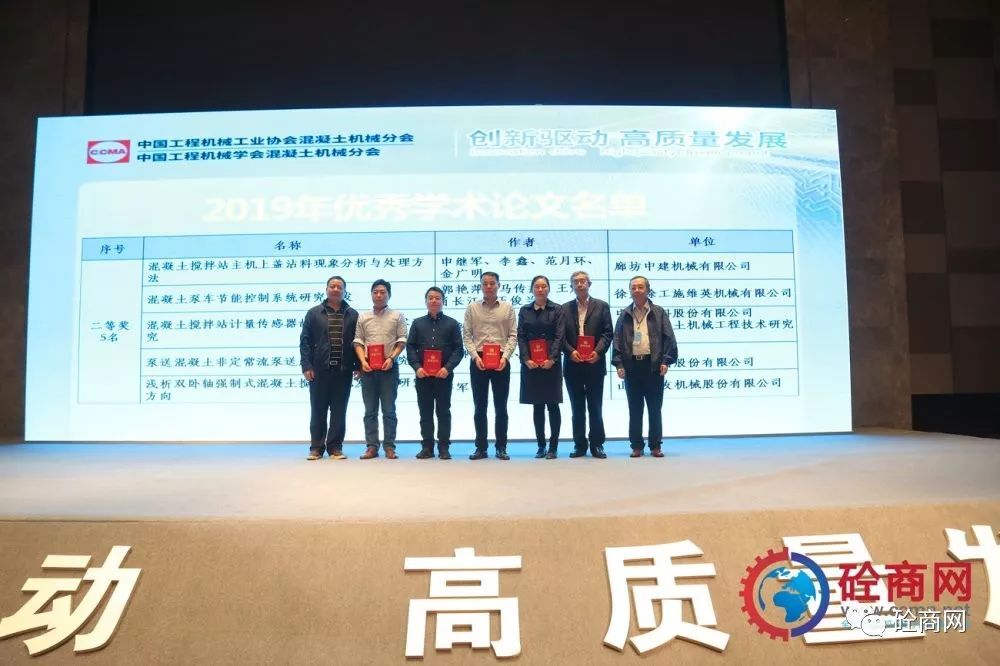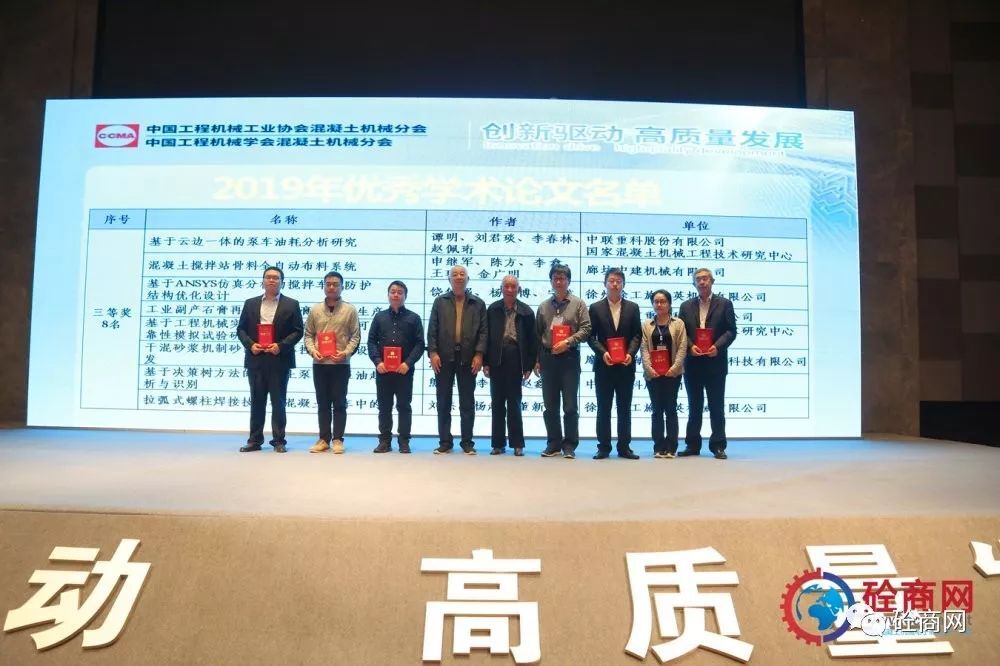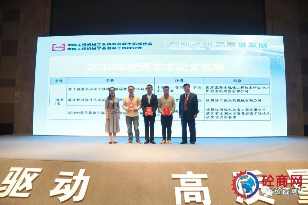 中國工程機械工業(yè)協(xié)會混凝土機械分會符忠軒會長以及中國工程機械工業(yè)協(xié)會混凝土機械分會顧問易君女士為優(yōu)秀論文一等獎獲得者頒發(fā)獲獎證書;