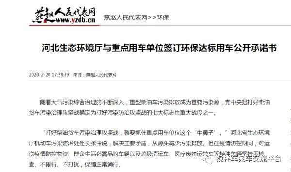 近日,據(jù)燕趙人民代表網(wǎng)報(bào)道,河北生態(tài)環(huán)境廳與重點(diǎn)用車單位簽訂環(huán)保達(dá)標(biāo)用車公開承諾書,加強(qiáng)對(duì)重型柴油車的相關(guān)治理。承諾書包括:進(jìn)出單位的所有重型柴油車、重型燃?xì)廛囘_(dá)到國(guó)五及以上排放標(biāo)準(zhǔn)。