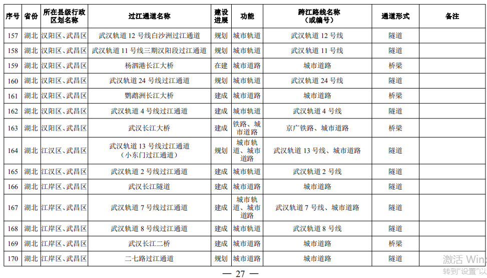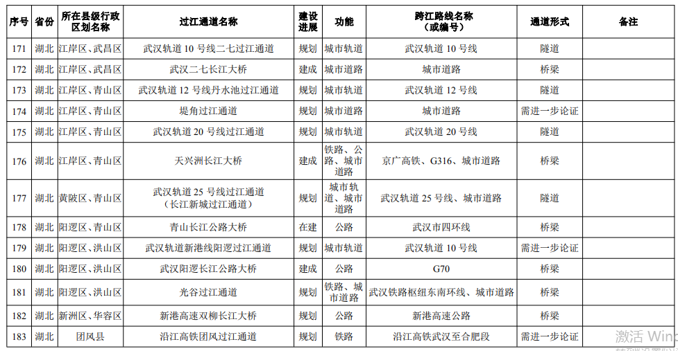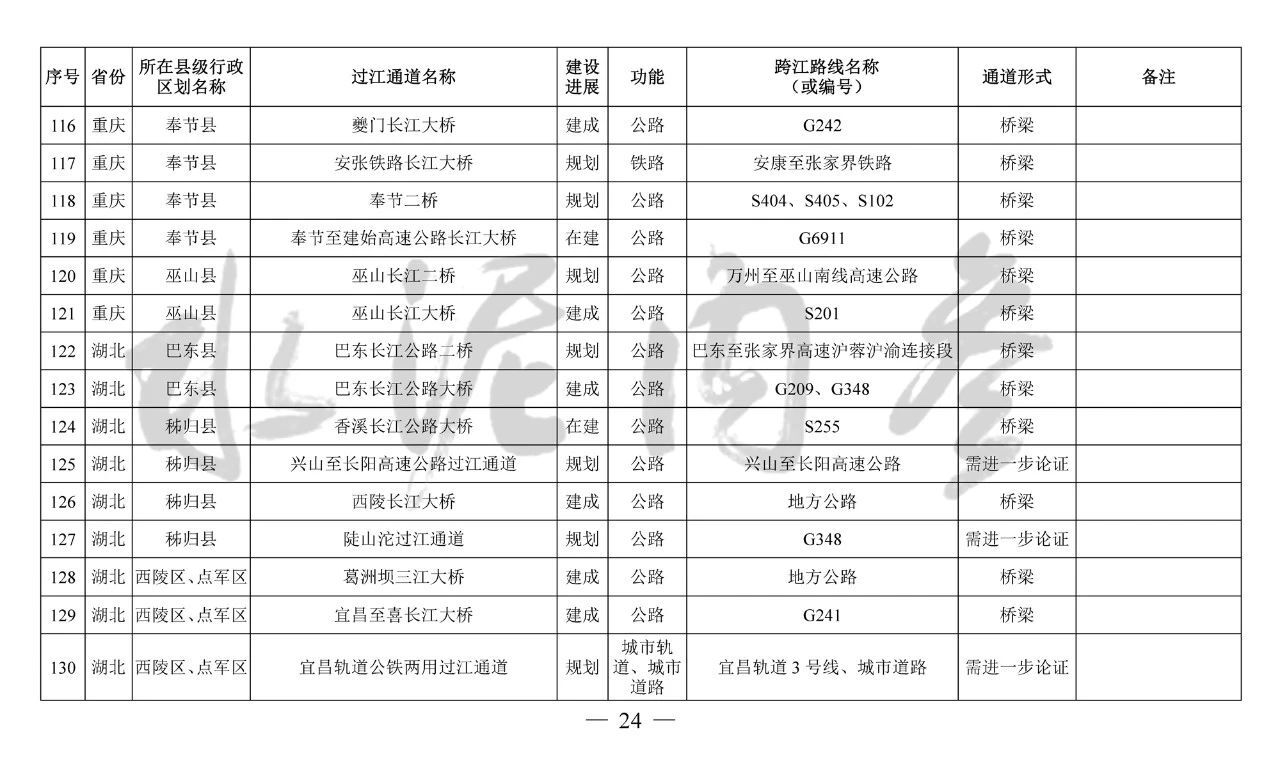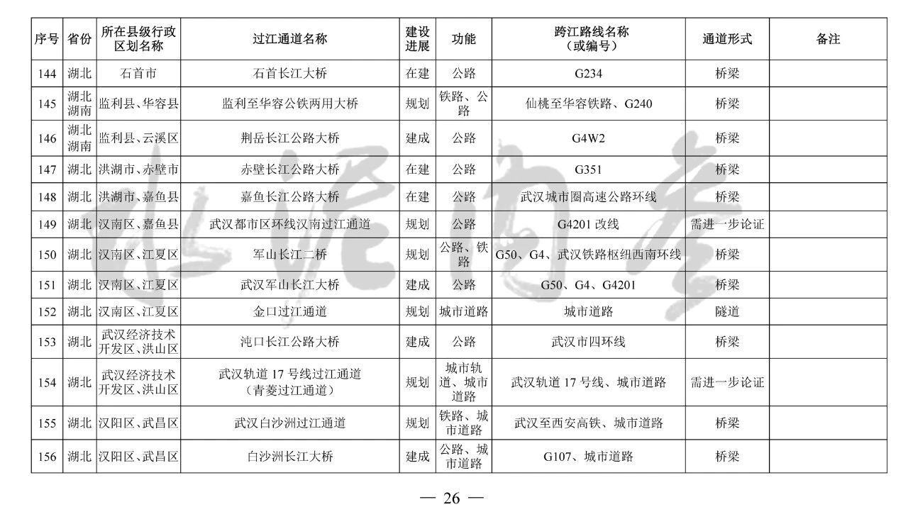 湖北省(24座):巴東長江公路二橋、興山至長陽高速公路過江通道、宜昌東艷路過江通道、宜都紅花套過江通道、枝江百里洲長江大橋、李埠長江公鐵大橋、觀音寺長江大橋、武漢都市區(qū)環(huán)線漢南過江通道、軍山長江二橋、武漢軌道17號線過江通道(青菱過江通道)、武漢白沙洲過江通道、武漢軌道12號線白沙洲過江通道、武漢軌道11號線三期漢陽段過江通道、武漢軌道13號線過江通道(小東門過江通道)、二七路過江通道、武漢軌道10號線二七過江通道、武漢軌道12號線丹水池過江通道、堤角過江通道、武漢軌道20號線過江通道、武漢軌道25號線過江通道(長江新城過江通道)、武漢軌道新港線陽邏過江通道、光谷過江通道、新港高速雙柳長江大橋、鄂黃第二過江通道鄂湘界(1座):監(jiān)利至華容公鐵兩用大橋