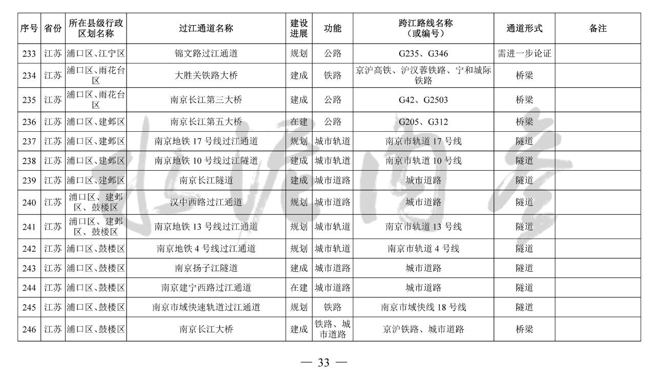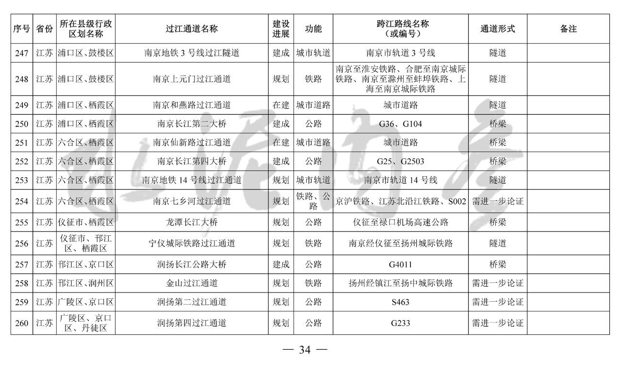 江蘇?。?3座):錦文路過江通道、南京地鐵4號線過江通道、南京市域快速軌道過江通道、南京上元門過江通道、南京七鄉(xiāng)河過江通道、龍?zhí)堕L江大橋、寧儀城際鐵路過江通道、潤揚(yáng)第二過江通道、江陰第二過江通道、江陰第三過江通道、張皋過江通道、蘇通第二過江通道、海太過江通道