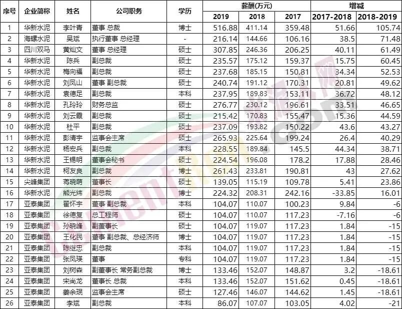 水泥行業(yè)上市企業(yè)員工薪酬排行榜