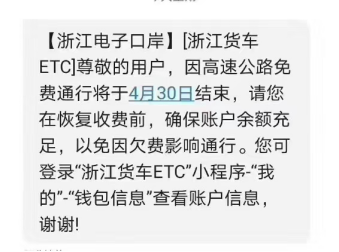今天,很多浙江ETC用戶卡友收到同樣一條短信,短信的內(nèi)容大致是:因高速公路免費(fèi)通行將于4月30日結(jié)束,請(qǐng)大家保持賬戶余額充足。