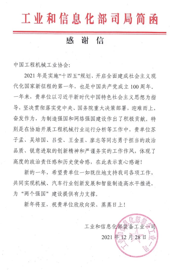近日,工業(yè)和信息化部裝備工業(yè)一司致函中國(guó)工程機(jī)械工業(yè)協(xié)會(huì),對(duì)協(xié)會(huì)一年來(lái),堅(jiān)持以習(xí)近平新時(shí)代中國(guó)特色社會(huì)主義思想為指導(dǎo),堅(jiān)決貫徹落實(shí)黨中央、國(guó)務(wù)院重大決策部署,迎難而上,奮發(fā)作為,在制造強(qiáng)國(guó)和網(wǎng)絡(luò)強(qiáng)國(guó)建設(shè)工作,特別是積極配合協(xié)助開(kāi)展工程機(jī)械行業(yè)運(yùn)行分析等工作表示感謝!
