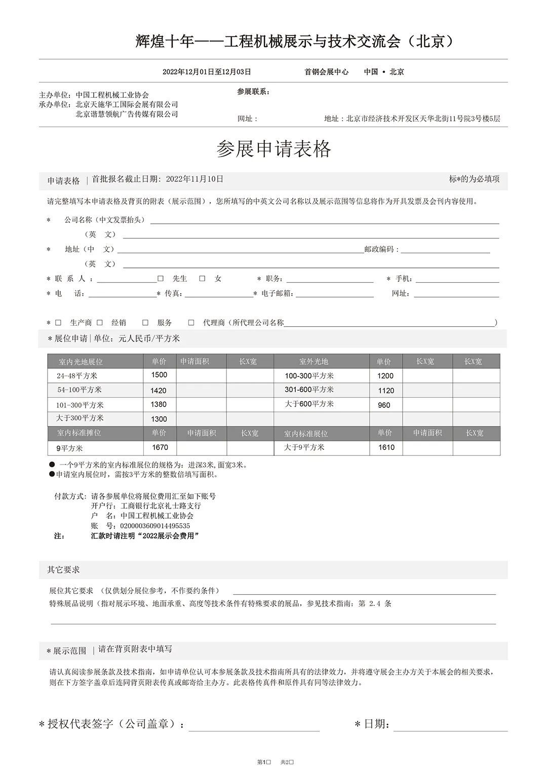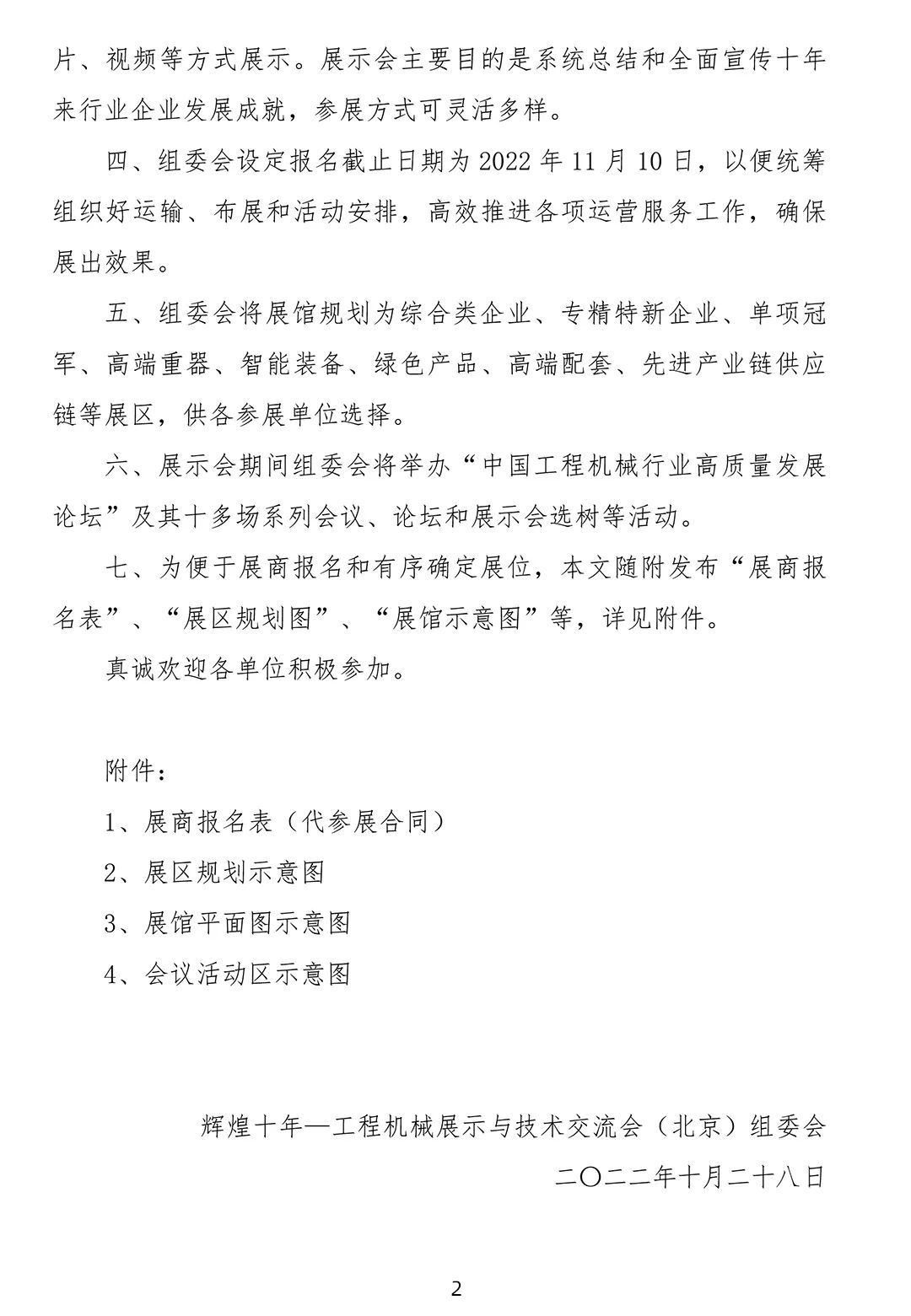 自協(xié)會(huì)發(fā)布舉辦“輝煌十年——工程機(jī)械展示與技術(shù)交流會(huì)(北京)”(以下簡(jiǎn)稱“展示會(huì)”)通知后,得到了各參展單位的快速響應(yīng)和積極支持,有的已經(jīng)報(bào)名大面積參展,有的正在履行審批程序或來(lái)電表示參加展出,組委會(huì)深表衷心感謝!為及時(shí)傳遞展會(huì)信息,服務(wù)好廣大展商,辦好本次展示會(huì),現(xiàn)向廣大展商正式發(fā)出邀請(qǐng),并將有關(guān)展示會(huì)方案說(shuō)明如下:一、為充分展示黨的十八大以來(lái)工程機(jī)械行業(yè)各領(lǐng)域取得的發(fā)展成就,協(xié)會(huì)研究決定召開(kāi)本次展示會(huì),邀請(qǐng)廣大協(xié)會(huì)會(huì)員和產(chǎn)業(yè)鏈上下游企業(yè)參展,共同分享企業(yè)發(fā)展成就和謀劃行業(yè)美好未來(lái)。二、展示會(huì)于2022年12月1日至3日在北京冬奧會(huì)滑雪大跳臺(tái)項(xiàng)目舉辦地——北京首鋼會(huì)展中心舉辦。屆時(shí)協(xié)會(huì)將邀請(qǐng)政府部門、相關(guān)用戶、媒體朋友和廣大觀眾到展示會(huì)現(xiàn)場(chǎng)參觀交流。12月3日(周六)實(shí)施社會(huì)公眾開(kāi)放日,讓社會(huì)觀眾充分體驗(yàn)工程機(jī)械發(fā)展魅力。三、北京首鋼會(huì)展中心適合舉辦室內(nèi)高品質(zhì)展示會(huì),室外面積有限,而且適合承重較輕的產(chǎn)品展出。組委會(huì)初步規(guī)劃總展出面積2萬(wàn)平米左右,希望各參展企業(yè)提供產(chǎn)業(yè)鏈上下游的先進(jìn)技術(shù)產(chǎn)品和高端裝備進(jìn)行展出,大型設(shè)備和示范工程應(yīng)用等可通過(guò)模型、圖片、視頻等方式展示。展示會(huì)主要目的是系統(tǒng)總結(jié)和全面宣傳十年來(lái)行業(yè)企業(yè)發(fā)展成就,參展方式可靈活多樣。四、組委會(huì)設(shè)定報(bào)名截止日期為2022年11月10日,以便統(tǒng)籌組織好運(yùn)輸、布展和活動(dòng)安排,高效推進(jìn)各項(xiàng)運(yùn)營(yíng)服務(wù)工作,確保展出效果。五、組委會(huì)將展館規(guī)劃為綜合類企業(yè)、專精特新企業(yè)、單項(xiàng)冠軍、高端重器、智能裝備、綠色產(chǎn)品、高端配套、先進(jìn)產(chǎn)業(yè)鏈供應(yīng)鏈等展區(qū),供各參展單位選擇。六、展示會(huì)期間組委會(huì)將舉辦“中國(guó)工程機(jī)械行業(yè)高質(zhì)量發(fā)展論壇”及其十多場(chǎng)系列會(huì)議、論壇和展示會(huì)選樹(shù)等活動(dòng)。七、為便于展商報(bào)名和有序確定展位,本文隨附發(fā)布“展商報(bào)名表”、“展區(qū)規(guī)劃圖”、“展館示意圖”等,詳見(jiàn)附件。4、會(huì)議活動(dòng)區(qū)示意圖