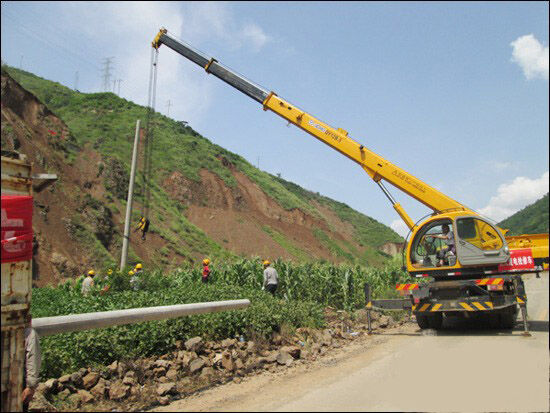 筆者連線徐工起重機事業(yè)部駐云南辦事處卞泳主任,他介紹了相關情況。8月7日上午,魯?shù)榭h城通往震中龍頭山鎮(zhèn)的道路經(jīng)過兩日的搶修和交通管制已基本暢通,武警交通部隊決定允許放行小型汽車起重機。指揮部要求南方電網(wǎng)公司迅速完成龍頭山鎮(zhèn)幾處電線桿及變壓設備的安裝。南方電網(wǎng)公司考慮道路情況惡劣,決定征用一直等候在交通管制境界線之外的一臺徐工QY12B.5汽車起重機,徐工12噸起重機迅速到達現(xiàn)場投入搶修。