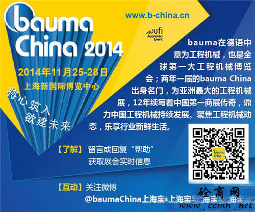 China 2014,11月25-28日行業(yè)翹楚絢麗登陸上海新國際博覽中心,工程機械行業(yè)產(chǎn)品全面細分展示??达L云變幻,捕行業(yè)動向,我們相約bauma China 2014!