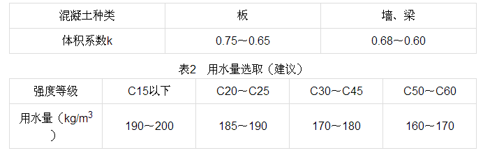 進(jìn)行配合比設(shè)計前,首先測出水泥、摻合料、砂、石等各種原材料的表觀密度和石子的振實密度。以石子的振實密度乘以體積系數(shù)即為石子的單方用量,石子體積系數(shù)可按表1選取。根據(jù)原材料情況和混凝土配制強(qiáng)度,用水量可按照經(jīng)驗或按照表2選取。