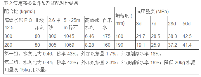 試配對比結(jié)果分析:試驗用相同材料,提高外加劑摻量,降低水灰比及用水量,相同砂率,在相同坍落度下28d 及 56d強度相近并降低了成本