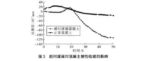 對比正常凝結(jié)混凝土和超時緩凝混凝土的收縮變形曲線(見圖3),可以發(fā)現(xiàn)超時緩凝混凝土的塑性收縮顯著高于正常凝結(jié)混凝土,這是由于超時緩凝混凝土的凝結(jié)時間很長,長時間處于塑性狀態(tài),和易性又差,水分比正常凝結(jié)混凝土更容易散失,且水分散失的時間更長。因此,發(fā)生超時緩凝現(xiàn)象的混凝土后應(yīng)加強混凝土的養(yǎng)護,尤其是在混凝土表面覆蓋保護以防止混凝土水分過量散失。