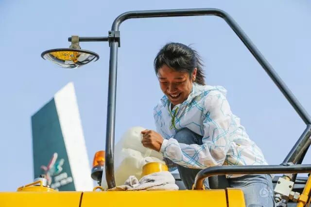 丁旭來到戶外練習(xí)場后,仔細將夏季用的柴油灌入挖掘機中,旁邊的同事提醒說:“可別灑出來”,讓她不禁靦腆地笑起來。