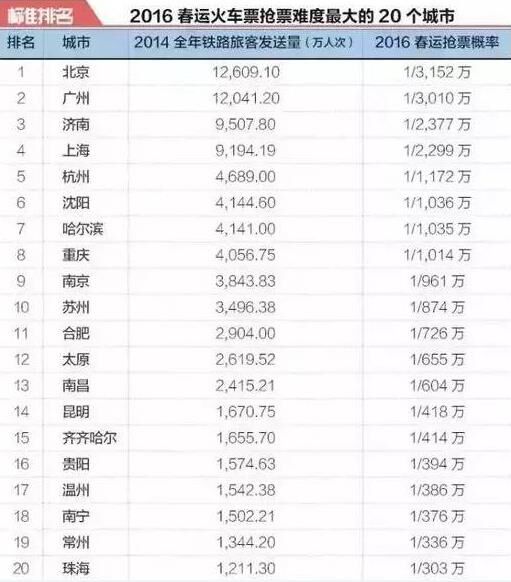 為了更直觀地反映春運火車票的購票難度,我們用全年旅客發(fā)送量轉(zhuǎn)換成“搶票概率”,比如說,北京全年旅客發(fā)送量是1.2億人次,那你每次買票的成功概率就是1.2億分之一。那么,春運旅客發(fā)送量如何計算?春運一般為期40天,而且集中度很高,根據(jù)我們的評估,期間的量相當于平時的3倍,比如,北京春運火車旅客發(fā)送量是“12609.10萬人次÷12個月x3倍=3152萬人次”。這個數(shù)據(jù),與鐵路部門公布的2015北京春運火車旅客發(fā)送量(2796.2萬人次)非常接近,我們認為還是非??孔V的。這樣,北京地區(qū)春運火車票搶票概率就是1/3152萬。概率越低,搶票的難度越大。