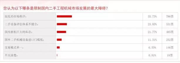 工程機械區(qū)別于其他行業(yè)一個重要的地方是,二手商品的回收利用尤為重要,因為一個機械的生命周期相對于快消品來說更長,所以在二手商品的回收、租賃同樣存在巨大機會。但是該行業(yè)目前發(fā)展前景不明朗。在慧聰工程機械網(wǎng)的一項“限制二手工程機械市場發(fā)展的最大障礙”的投票中,“混亂的市場秩序”得票最高,796票,“二手設備評估體系不健全”排名第二,得票531,“國內新機的巨大庫存”排名第三,得票485。