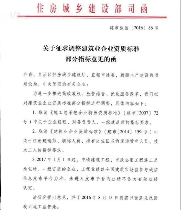 近日,住房和城鄉(xiāng)建設(shè)部建筑市場監(jiān)管司就“調(diào)整建筑業(yè)企業(yè)資質(zhì)標(biāo)準(zhǔn)部分指標(biāo)”征求意見(建市施函[201686號),主要內(nèi)容有以下兩點: