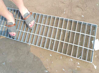 2、T2踏步板:由負(fù)載扁鋼和橫桿按一定間距經(jīng)緯排列,兩邊帶側(cè)板螺栓固定的踏步。
