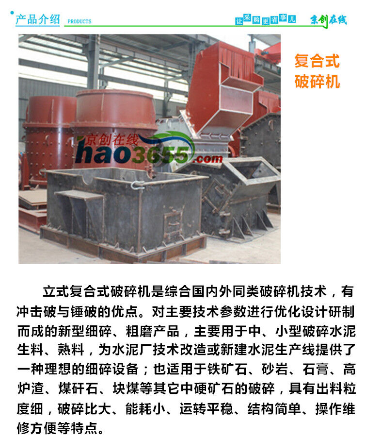 立式復(fù)合式破碎機(jī)1500簡(jiǎn)稱為復(fù)合破,是破碎生產(chǎn)線和制砂生產(chǎn)線中常用設(shè)備之一。復(fù)合破碎機(jī)是一種無(wú)篩條、可調(diào)式細(xì)碎設(shè)備,可廣泛適用于水泥廠的生料、熟料細(xì)碎作業(yè),同時(shí)也可用于白云石、焦寶石、鉛鋅礦、蛇紋石、高爐渣、煤矸石、磷礦石等中等硬度物料的細(xì)碎作業(yè),特別適用于硬質(zhì)石灰?guī)r、白云巖、花崗巖、玄武巖等人工造砂或高速公路路面石料的加工破碎。