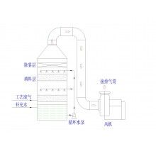 內設逆向填料吸收系統(tǒng)、噴淋系統(tǒng)、脫霧裝置系統(tǒng)、下設供水箱、供水泵系統(tǒng)、進出風口、風機、風管、吸罩組成系統(tǒng)。