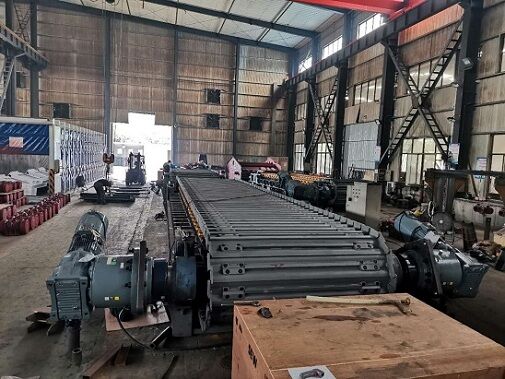 (3)輥體通過卡鍵定位在通軸上,并鎖緊,輥體長(zhǎng)度與負(fù)荷槽板上固定運(yùn)轉(zhuǎn)鏈條的加厚槽板等長(zhǎng)并對(duì)應(yīng),支承回程槽板負(fù)荷。