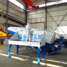 落地式砂石分離機(jī)整套系統(tǒng)主要由:攪拌車加水清洗裝置,溜槽裝置,砂石漿水分離裝置,和泥漿水后處理裝置組成?;炷凛斔驮O(shè)備清洗后,將殘余混凝土排入溜槽中,在高壓水流沖擊下,經(jīng)溜槽進(jìn)入砂石分離機(jī),在不斷旋轉(zhuǎn)的分離機(jī)作用下,對(duì)混凝土進(jìn)行充分的清洗,同時(shí)將砂石、漿水進(jìn)行分離,分離后的砂、石在導(dǎo)料葉片的作用下背向流動(dòng)至出料口排出分離機(jī)落入振動(dòng)篩分機(jī),通過(guò)篩分將沙、石子分開,分別堆放。清洗后的漿水從分離機(jī)的溢水口排出進(jìn)入濃漿池,經(jīng)污水泵加壓打到旋流器除去多余固體微粒,降低漿水濃度,進(jìn)入攪拌池回收利用。進(jìn)入攪拌池的漿水為了防止沉淀凝固,需通過(guò)攪拌器的作用,攪拌器的工作為間歇式。分離出水泥漿在連續(xù)的攪拌器作用下,再通過(guò)高壓污水泵輸送到攪拌樓中待生產(chǎn)再利用。整個(gè)控制系統(tǒng)設(shè)有手動(dòng)和自動(dòng)控制,方便控制設(shè)置,整個(gè)系統(tǒng)運(yùn)行可靠,故障率低,維護(hù)量少等特點(diǎn)。