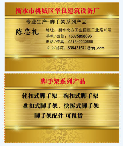 河北衡水華良建筑設(shè)備廠是集生產(chǎn)、銷售、租賃于一休的專業(yè)腳手架生產(chǎn)廠家,聯(lián)系電話 :150-7589-8696