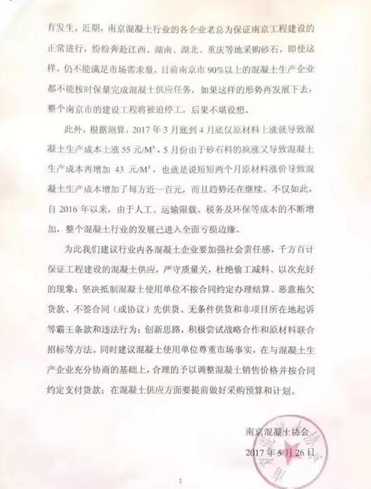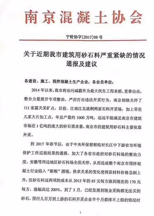 5月26日,南京混凝土協(xié)會關(guān)于近期南京市建筑用砂石料嚴重緊缺的情況發(fā)布通報及建議。公告中提到:目前江南江北僅剩的兩家石料開采場遠遠不能滿足南京市建筑市場近1億噸的砂石需求量,全市建筑用砂石料主要依靠外采。尤其是在今年春節(jié)以后,中央環(huán)保督察組對長江中下游省市環(huán)境保護巡視結(jié)果的通報,加大了各省市政府對砂石料場的整治力度,周邊地區(qū)砂石料場全面關(guān)停,從而造成全市預拌混凝土行業(yè)陷入“斷糧”的困境,這也直接導致原材料價格急劇上升。