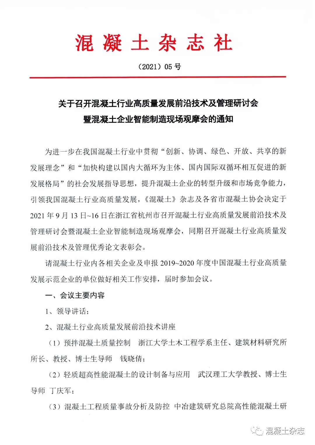 為進一步在我國混凝土行業(yè)中貫徹“創(chuàng)新、協(xié)調、綠色、開放、共享的新發(fā)展理念”和“加快構建以國內大循環(huán)為主體、國內國際雙循環(huán)相互促進的新發(fā)展格局”的社會發(fā)展指導思想,提升混凝土企業(yè)的轉型升級和市場競爭能力,引領我國混凝土行業(yè)高質量發(fā)展,《混凝土》雜志及各省市混凝土協(xié)會決定于2021年9月13日~16日在浙江省杭州市召開混凝土行業(yè)高質量發(fā)展前沿技術及管理研討會暨混凝土企業(yè)智能制造現(xiàn)場觀摩會,同期召開混凝土行業(yè)高質量發(fā)展前沿技術及管理優(yōu)秀論文表彰會。